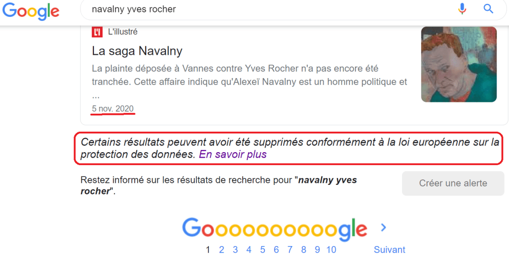 Hormis deux articles datés de mi-janvier sur le titre de presse local Ouest France (NB: une plainte des frères Navalny contre Yves Rocher pour diffamation est en cours au tribunal de Vannes en Bretagne), les quelques références récentes proviennent toutes de médias basés en Russie (Sputnik, Moscow Times), et donc non concernées par le droit à l’oubli européen.